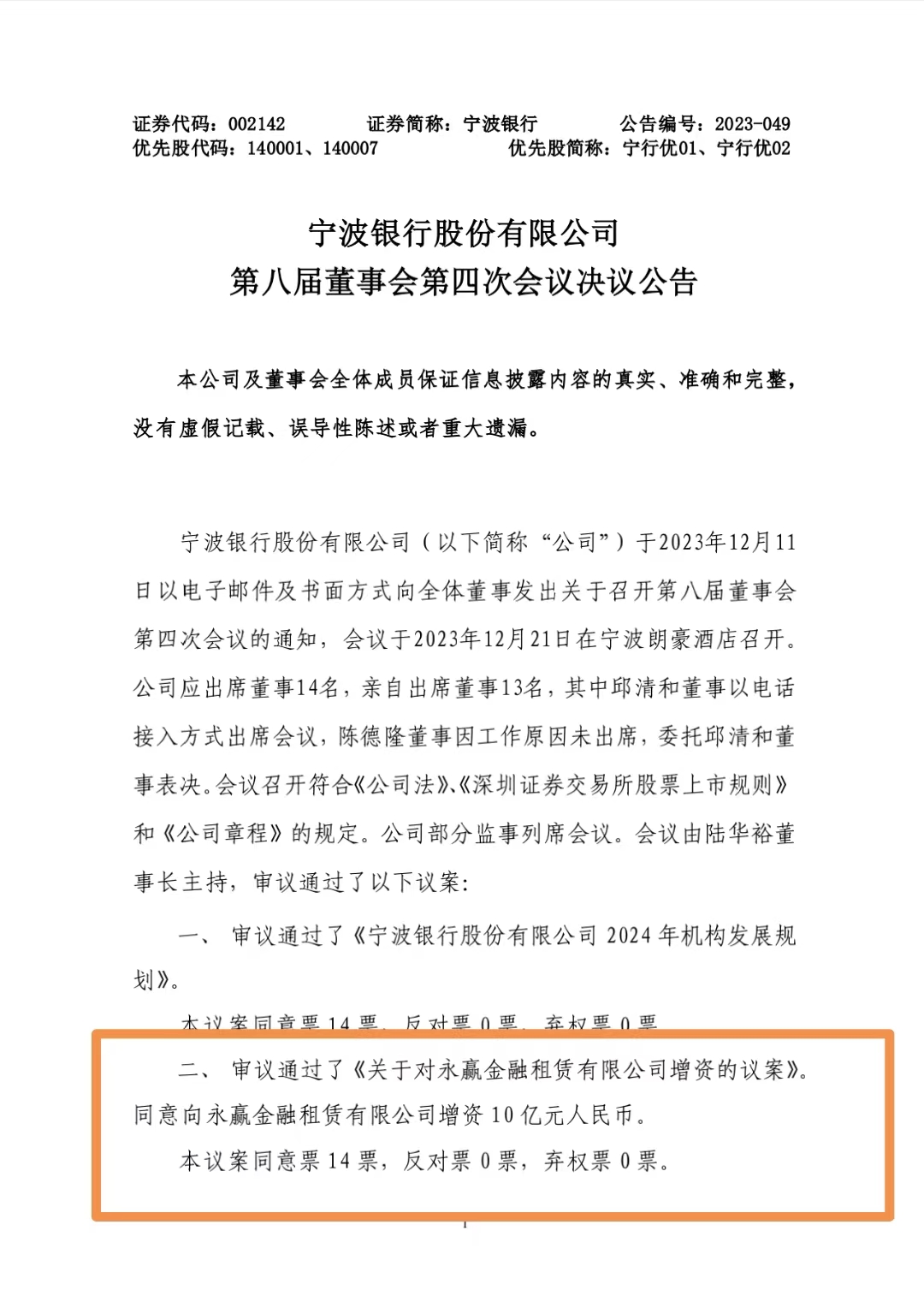 12月22日晚间,宁波银行发布公告称,董事会审议通过了《关于对永赢金融租赁有限公司增资的议案》,同意向永赢金融租赁有限公司(下称永赢金租)增资10亿元。今年2月11日,宁波银行刚刚对永赢金租启动一轮10亿增资。而这次董事会通过的增资决议,也意味着永赢金租在一年内两度计划增资金租子公司。